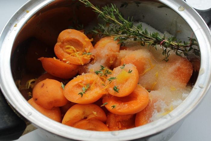 2. Добавить апельсиновый сок (или лимонный) и цедру, с 3-4 веточек тимьяна снять листики, остальной тимьян связать ниткой в пучок, добавить к абрикосам и оставить на пару часов.  Абрикосовое варенье с миндалём и тимьяном