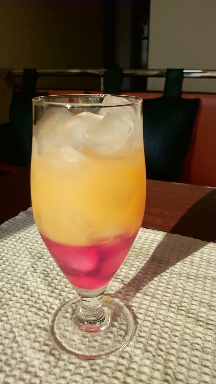 4. Так же по льду налить охлажденную смесь апельсинового и ананасового соков, должны получиться слои. Бамбл