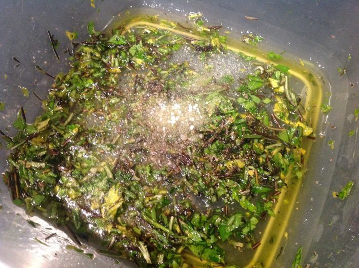 1. Зелень помойте и измельчите. Смешайте ее с оливковым маслом, солью и перцем.