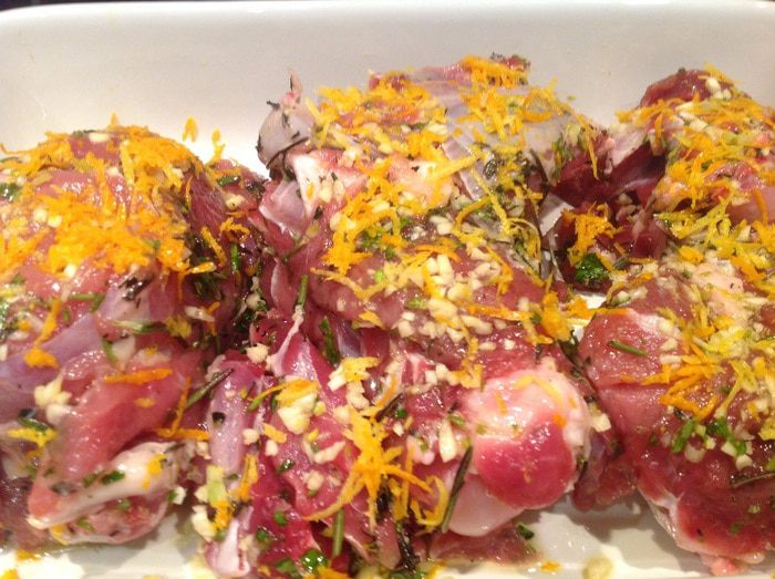 5. Смажьте форму для запекания маслом, выложите в нее баранину, приправьте чесноком и цедрой лимона и апельсина. Накройте фольгой и запекайте 30 минут. Баранина, запеченная с травами