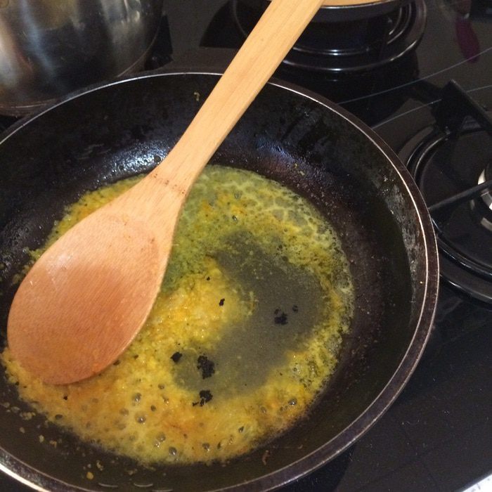 5. На сковороде слегка томим цедру на сливочном масле, добавляем сок апельсина, 5 ст. л. сахара, семечки ванили. Томим 3 минуты. Блинчики в ванильно-цитрусовом сиропе