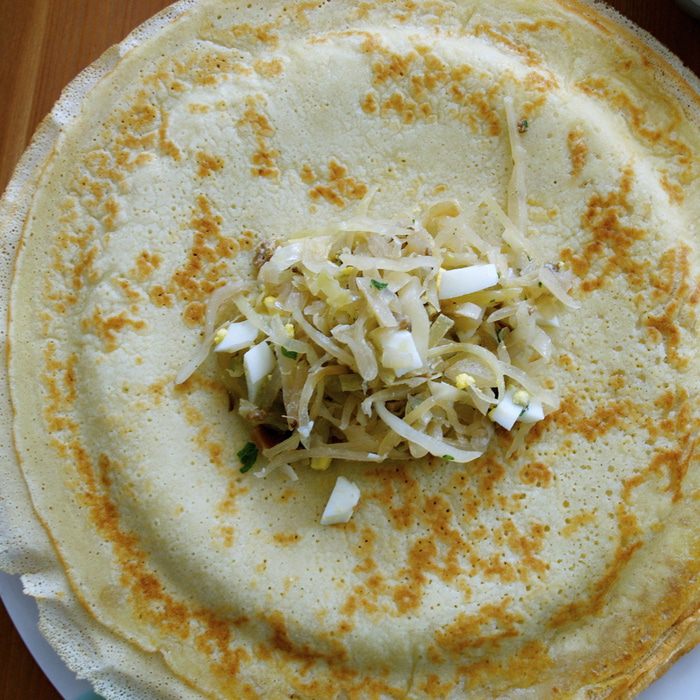 6. Тем временем испечь блинчики. Кстати, мне ОЧЕНЬ понравились блинчики по этому рецепту. Получаются идеальными! Рекомендую! ))) Блины с капустой