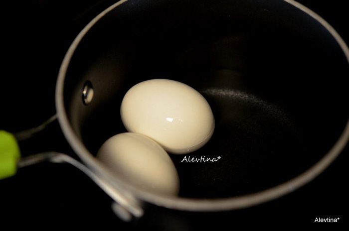 1. Яйцо отварить, очистить, порезать на 4 части каждое. Cалат с кунжутной-чесночной заправкой