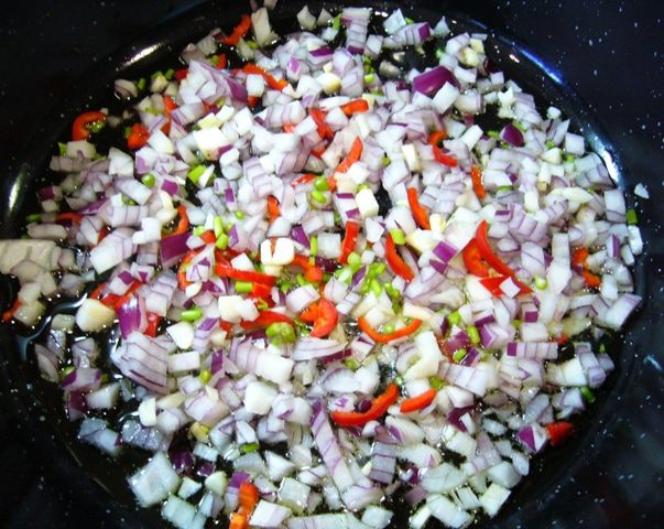 В сотейнике с разогретым оливковым маслом обжарить лук, чеснок, рубленые веточки кинзы, бОльшую часть перца чили (оставить немного для подачи) – 10 мин.