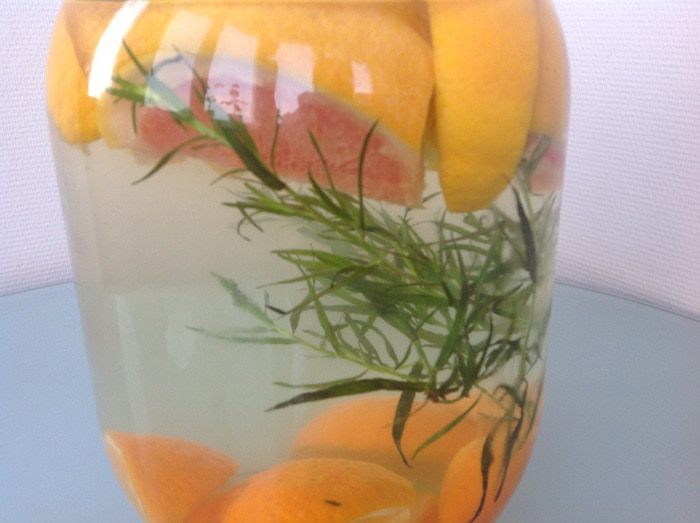 1. Фрукты помойте и нарежьте на дольки. Веточки тархуна помойте и обдайте кипятком, чтобы выпустить аромат. Цитрусовая вода