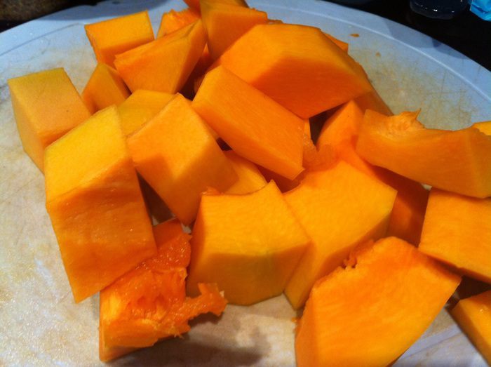 1. Сначала сделаем тыквенное пюре: для этого почистите тыкву, нарежьте небольшими кусочками. Чизкейк "Логово пауков"