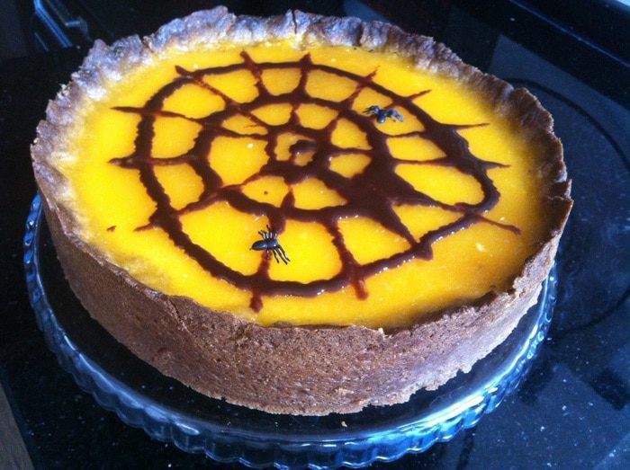 9. По желанию украсьте чизкейк шоколадным сиропом и паучками. Чизкейк "Логово пауков"
