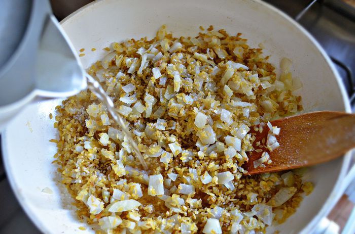 5. К обжаренному луку добавить булгур, соль и залить 250мл кипятка. Закрыть сковороду крышкой и готовить 15 мин, периодически помешивая. Если понадобится, добавить немного воды. Долма (толма) по-армянски