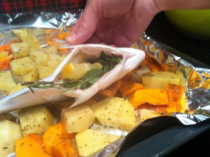 1. Духовку разогрейте до 170 градусов. Почистите картофель и тыкву. У тыквы удалите семена. Порежьте крупными ломтиками. Приправьте тимьяном, орегано, посолите, добавьте оливковое масло и перемешайте. Дорада, запеченная с овощами и травами