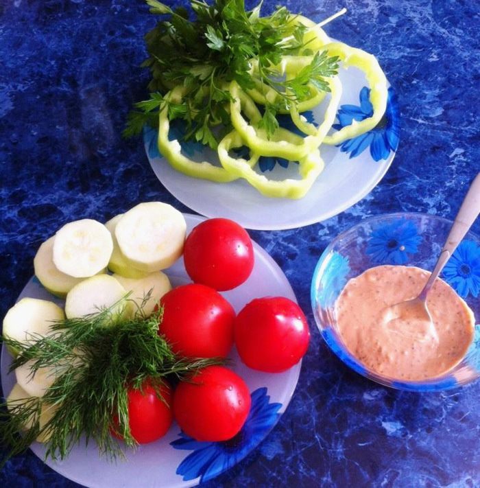 1. Подготовим овощи. Перец, кабачок и помидор нарежем кольцами, толщиной в 1 см. Сметану смешаем с соусом и горчицей. Экспресс-завтрак, или ватрушки с овощами