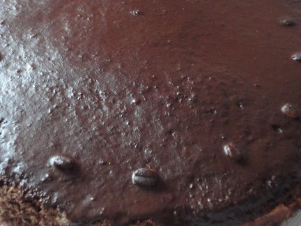 4. 7. Приготовить помадку. Сахарную пудру смешать со сливками и прогреть на огне до растворения сахарной пудры, но не доводить до кипения. Горячими сливками залить кусочки шоколада и оставить на 2-3 минуты до его растворения. Добавить сливочное масло, перемешать. По краю торта выложить зерна кофе и залить помадкой. Финский торт "Мечта"