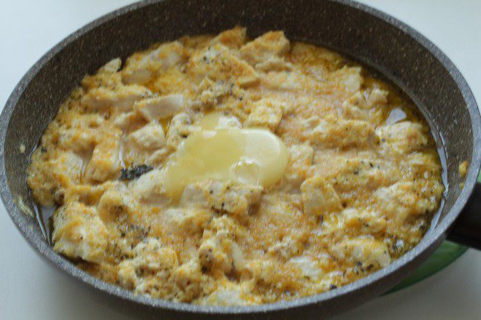 5. Отключить огонь. Добавить желток, по желанию зелень и перемешать. Фрикасе из курицы