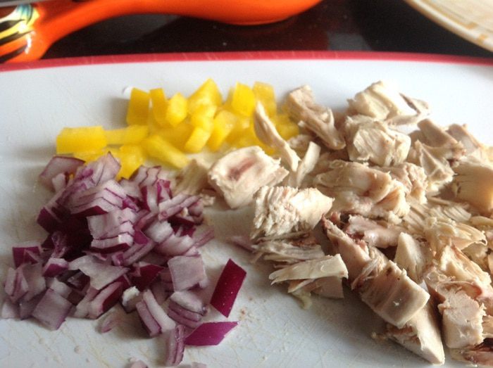 1. Духовку разогрейте до 180 градусов. Мелко порежьте лук, болгарский перец и остатки курицы. Фриттата с курицей