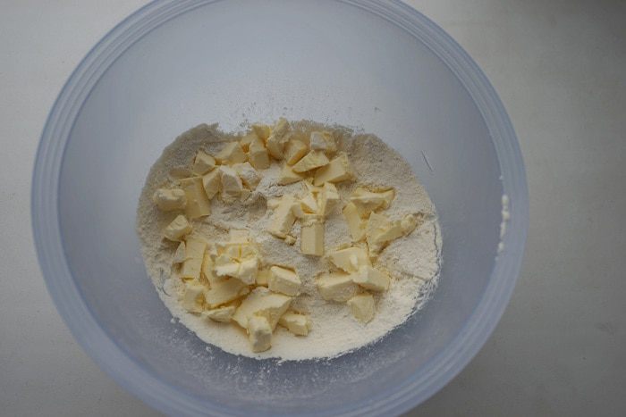 1. Готовим тесто. В миске смешать муку и соль. Добавить порезанное на мелкие кусочки масло.