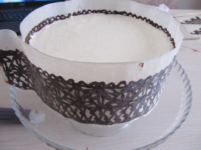 15. Для кружевного шоколадного воротника и верх торта. Растопите шоколад на водяной бане. Нарисуйте узор на пергаментной бумаге. Переложите растопленный шоколад в бумажный рожок или в специальный кондитерский карандаш, обведите шоколадом контуры рисунка, дайте чуть остыть. Гречневый торт с брусничным компотом