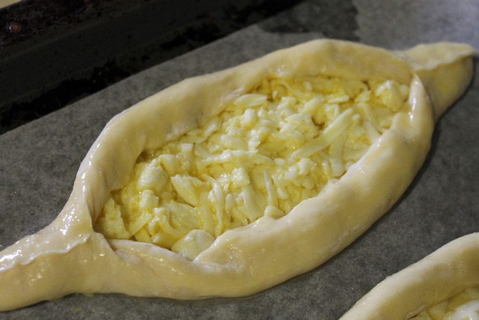 6. Тесто разделить на 7 равных частей, раскатать скалкой в пласты, придав форму больших овалов. На каждый овал выложить равное количество начинки, оставив свободными края. Хачапури по-аджарски