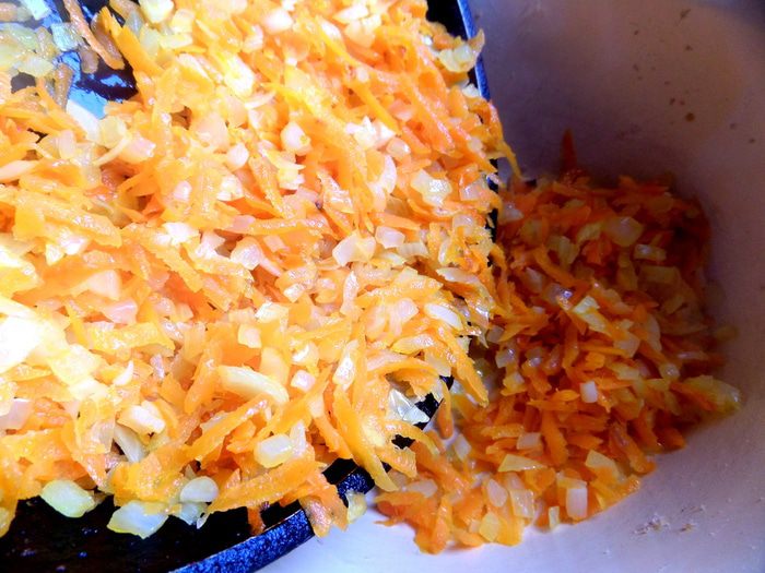 13. Обжарим овощи на масле до золотистости и переложим отдельно в миску. Хлебные корзиночки с паштетом из печени и сыра