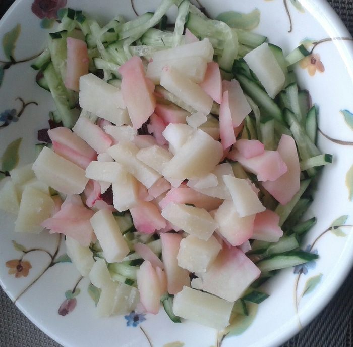 8. Добавляем отваренный заранее картофель. Холодный суп на свекольном квасе
