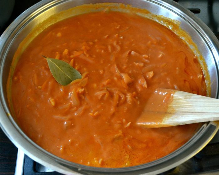 8. Дать хорошо разойтись и довести соус до кипения. Положить лавровый лист. Индюшиные тефтели с капустой