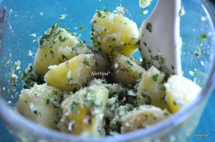 3. Готовый картофель, порезать на половинки. Выложить из кухонного комбайна порубленную зелень, смешать с картофелем.