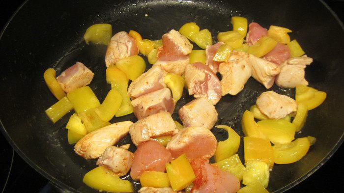 4. Перец и куриное филе режем средними кусочками. Картофельный салат с курицей, беконом и редисом