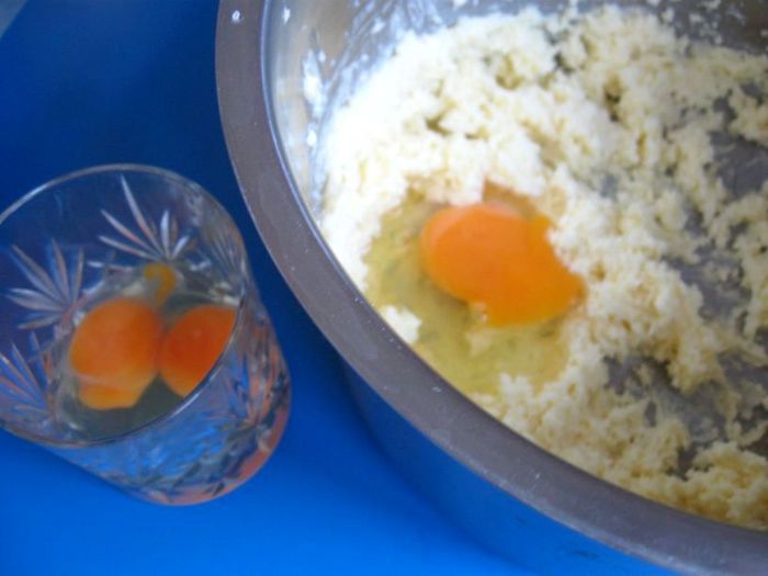 2. Масло растереть с сахаром до светлого цвета. Взбить миксером, постепенно добавляя яйца. Кекс "Столичный"