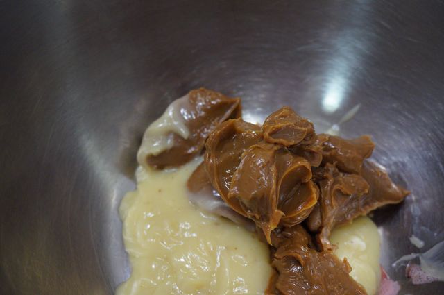 10. Сгущенка (у меня пополам сырая и вареная) - добавить к ней сок, растворенное желе, размешать, поставить минут на 10-15 в холодильник, чтобы смесь не была горячей, когда добавляем сливки. Клубничное шифоновое пирожное