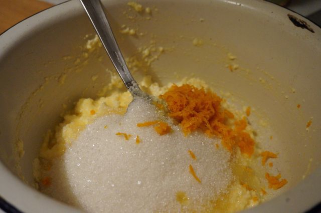 2. Добавляем сахар, соль, натертую цедру большого апельсина. Кокосово-апельсиновое печенье