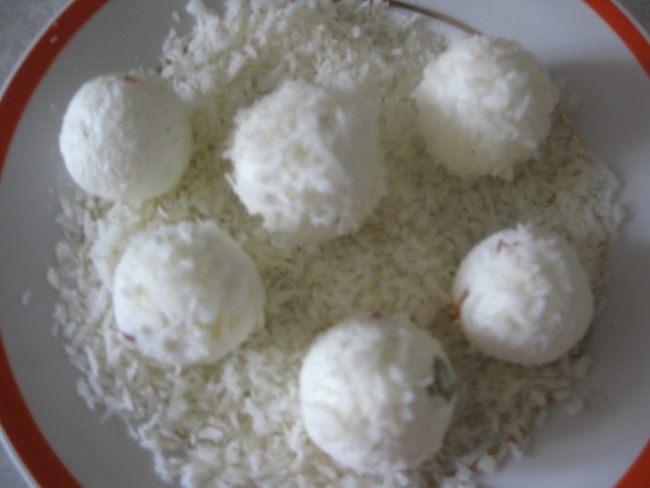 4. Обвалять их кокосовой стружке. У меня белая кокосовая стружка и они похожи на Рафаэло, если кокосовая стружка цветная, то конфеты получаться веселенькими. Конфеты творожно-мармеладные