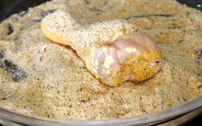 4. ...затем опустить в яичную смесь и обвалять в сухарях. Курица, зажаренная по-южному