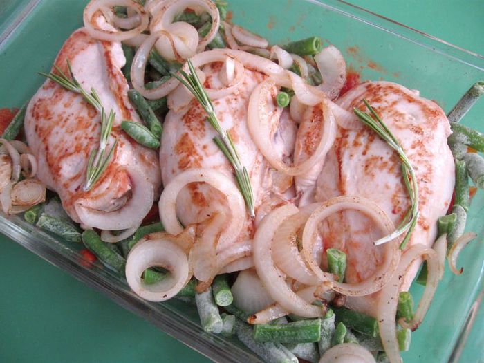 5. На раскаленной сковороде с маслом обжарить филе с двух сторон. Приготовить свежемороженую зеленую стручковую фасоль( резаную), пассированные помидоры, лук почистить, нарезать кольцами, обжарить (недолго) на сковороде, в которой в которой жарилась курица. Положить куриное филе в форму (керамическую, стеклянную) для запекания. Куриное филе «Птичка с кармашком»