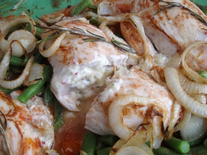 6. Дополнить пассированными помидорами, зеленой стручковой фасолью, луком. На каждый кусочек положить по небольшой веточке розмарина. Куриное филе «Птичка с кармашком»