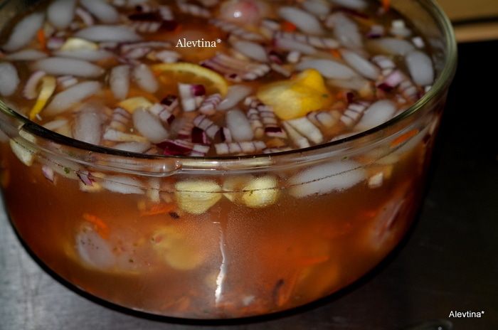 2. Убрать пакетики добавить коричневый сахар, соль, мелко порезанный лук,лимон порезанный, чеснок мелко порезанный, черный перец.и лед . Дать постоять около часа. Затем добавить куриные части как бедрышки,ножки. Закрыть пленкой поставить в холодильник на ночь. Куриные ножки в чайном рассоле