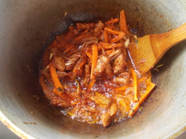 13. Затем наливаем воды или бульона, чтобы она покрывала овощи с мясом. Тушим пол часа. Лагман с тянутой лапшой
