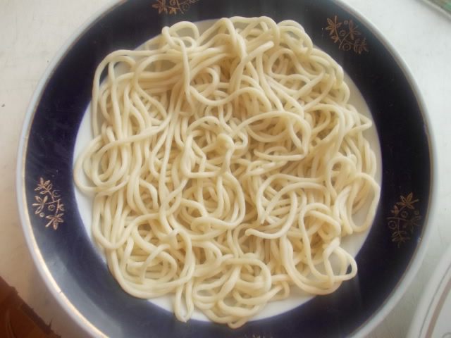 20. Ставим на огонь кастрюлю с подсоленной водой для варки лапши и начинаем ее тянуть, самая ответственная работа. На стол берем одну полосочку теста из тарелки и начинаем одной рукой раскатывать, а второй тянуть лапшинку дальше пальчиками. Чем-то похоже на то, если кто видел, как прядут нитки шерстяные на веретене, работа пальчиками та же. Не бойтесь, лапша упругая и не будет рваться, ну конечно если ее специально не тянуть! Лагман с тянутой лапшой