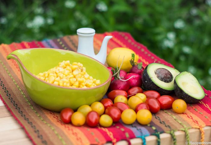 5. Из кукурузы сольем всю жидкость. Теперь все ингредиенты сложим в большую миску, зальем заправкой и тщательно перемещаем. Все! Куда ж проще?:-) Летний салат