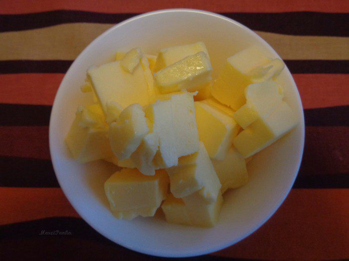 Сливочное масло порезать кубиками и оставить нагреваться до комнатной температуры.