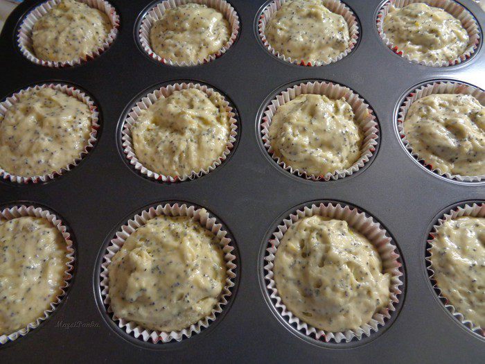 7. Выложить с помощью двух ложек тесто в бумажные формочки для маффинов. Лимонно-маковые маффины на йогурте