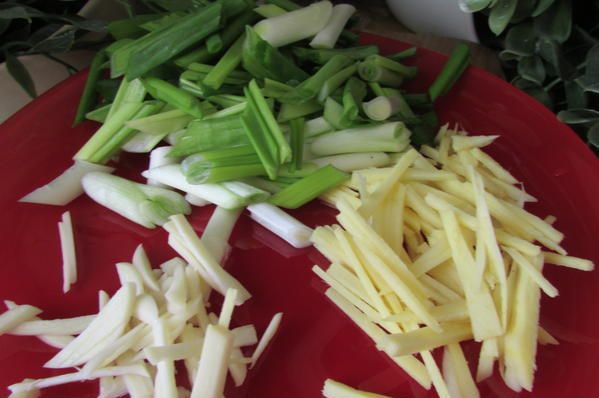4. Зелёный лук нарежьте по диагонали небольшими кусочками. Чеснок и имбирь очистите и измельчите. Лосось "Рыбная Бандероль"