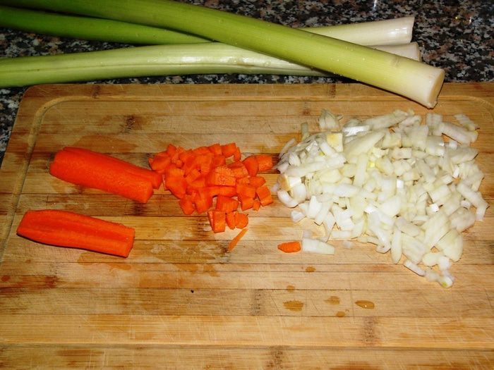 Лук и морковь мелко нарезаем. Морковь можно не добавлять, но я люблю ее присутствие из-за яркого цвета.