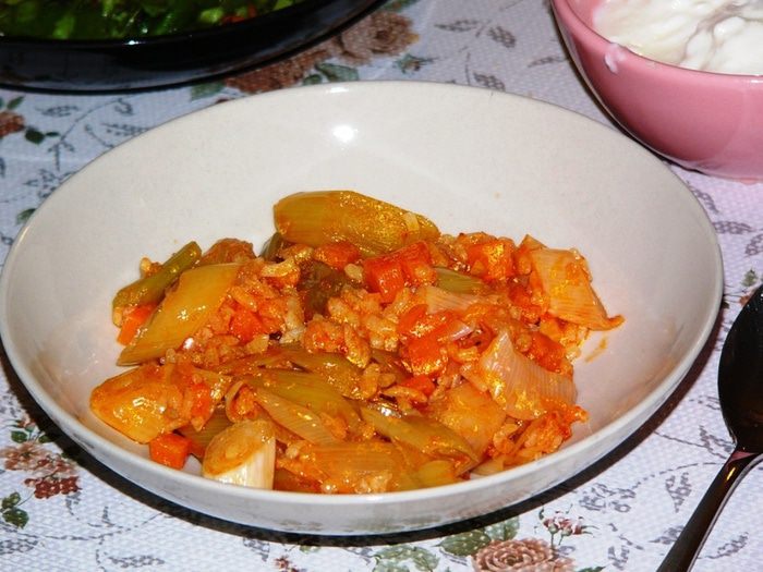Лук-порей, тушеный с рисом (Zeytinyaglı pırasa)
