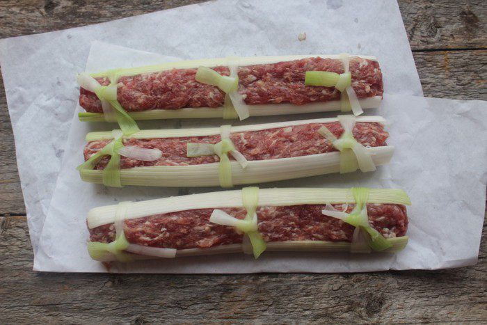 2. Заполнить луковые трубки фаршем. Люля-кебаб в порее