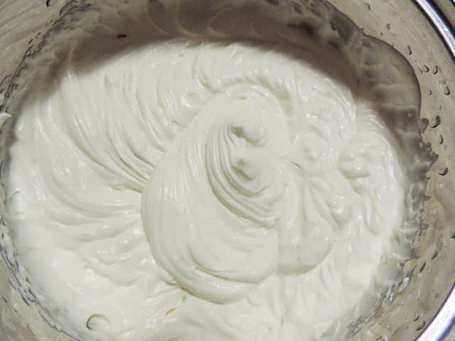 11. Для оформления взбить сметану с сахарной пудрой (50г) и половиной пакетика загустителя до твердых пиков.