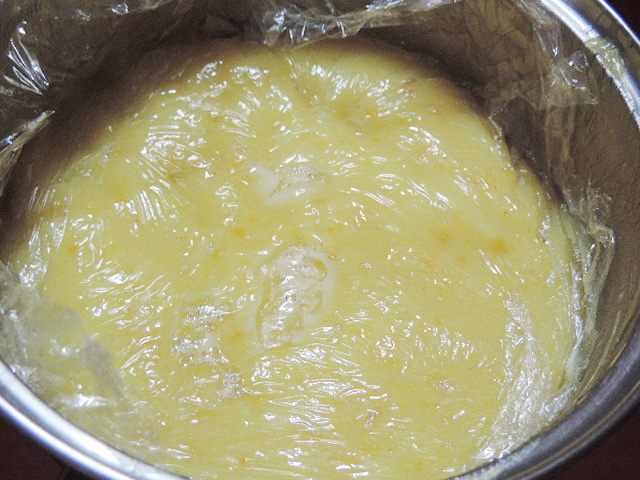 3. Накрыть пищевой пленкой в контакте с поверхностью курда и отправить в прохладное место. Когда курд достаточно остынет - убрать его в холодильник. Маково-апельсиновый торт