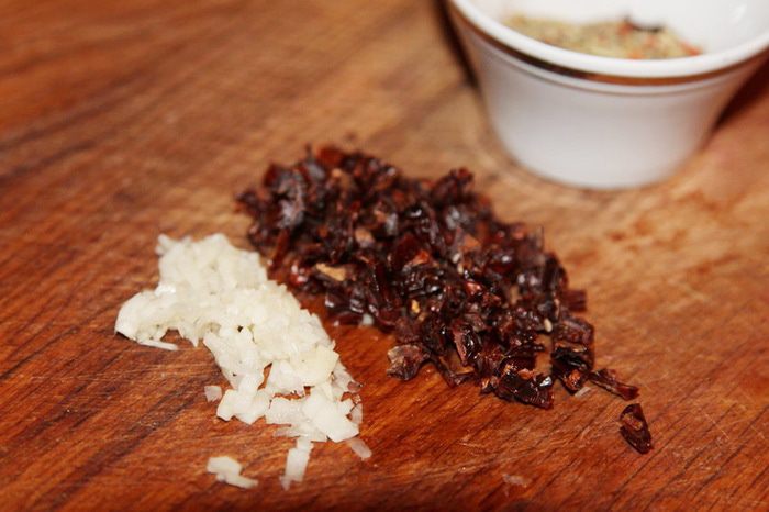 2. Нарезаем мелко чеснок и вяленый помидор. Маринованный сыр тофу