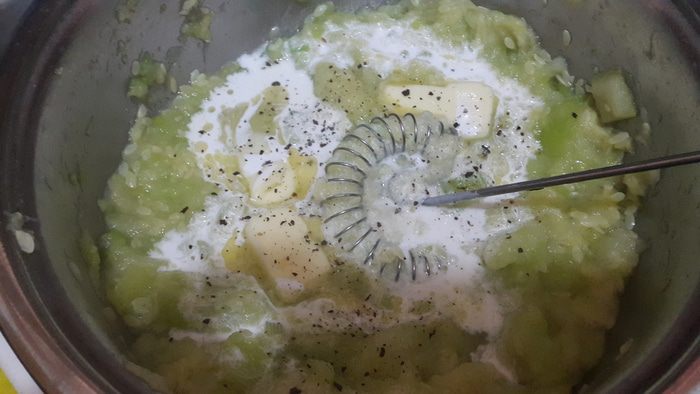 9. Слить воду с кабачков, добавить 2 ст. л. сливок, сливочное масло, поперчить и размять в пюре. Мясные котлеты с гречкой и кабачковое пюре