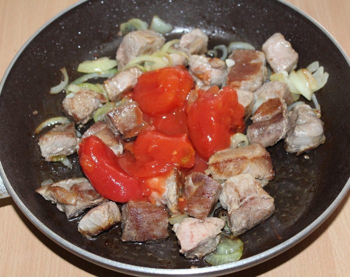 2. Добавляем томаты в собственном соку «Помидорка». Мясо, тушенное со сливой