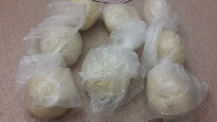 Все компоненты соединяем в единое тесто. Приготовленное тесто разделите на 8 равных кусочков. Сформируйте из них шарики и поставьте тарелку с тестом в морозильник. Минимум на 2 часа (я оставила на ночь). За два часа до готовки достаём заготовки и перекладываем в холодильник.
