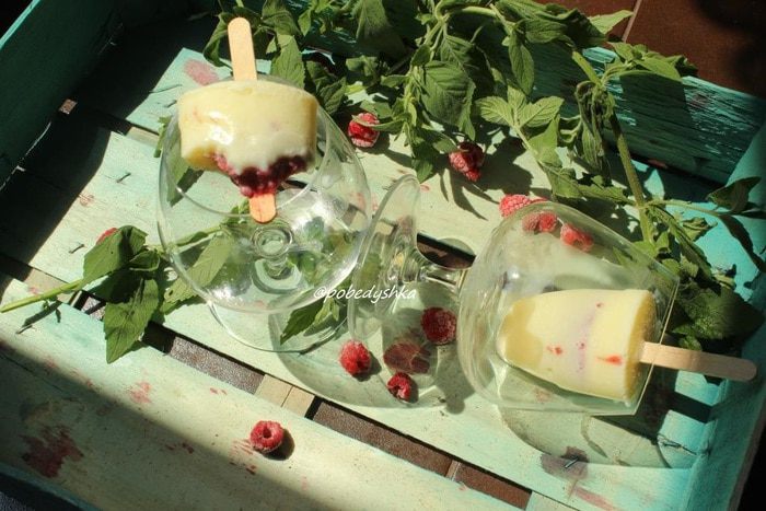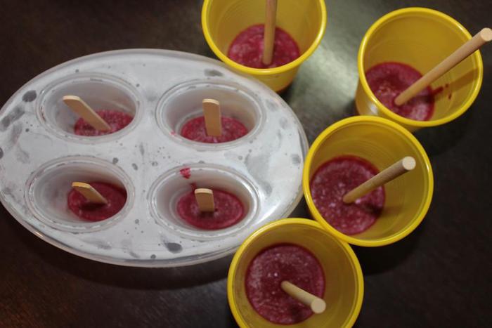 8. В начинающее застывать малиновое конфи вставить палочки для мороженого и вернуть обратно в морозилку. Молочное мороженое с малиновым конфи