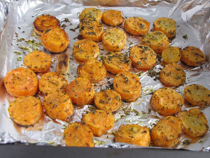 2. Морковь почистить, нарезать кружочками. Добавить оливковое масло, травы, зубчики чеснока. Все хорошо перемешать. Выложить в форму, застеленную фольгой. Морковный суп с белой фасолью